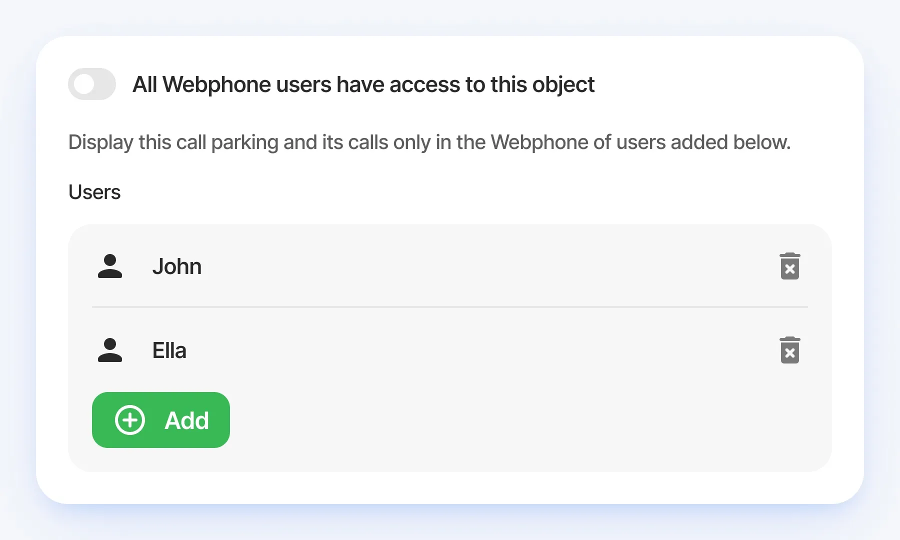 However, for enhanced security and a streamlined setup going forward, all newly created Call Parking objects will have this setting disabled by default. When creating a new object, you will now need to explicitly define which users have access.