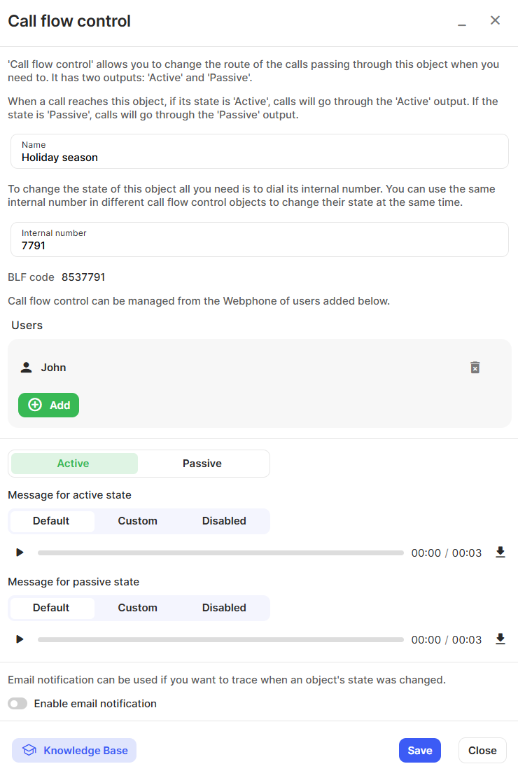 To make it easy for our users to implement, we have marked the different endpoints of the toggle switch, Active and Passive. When the toggle switch is flipped to active, calls will be forwarded to active clause in the call-flow (Users or endpoints, in this case, can represent another branch office, a ring group, queue etc.). The switch continues in the active state until the toggle is changed manually via the PBX portal or a feature call placed by a handset. When set to passive, calls will be redirected the clause configured from inside the PBX configuration, this as an example could be IVR voice menus, call queues, ring groups etc. As an added security feature it is also possible to configure an email notification, which will allow you full viability as to when the toggle has been utilised and the current state it is in.