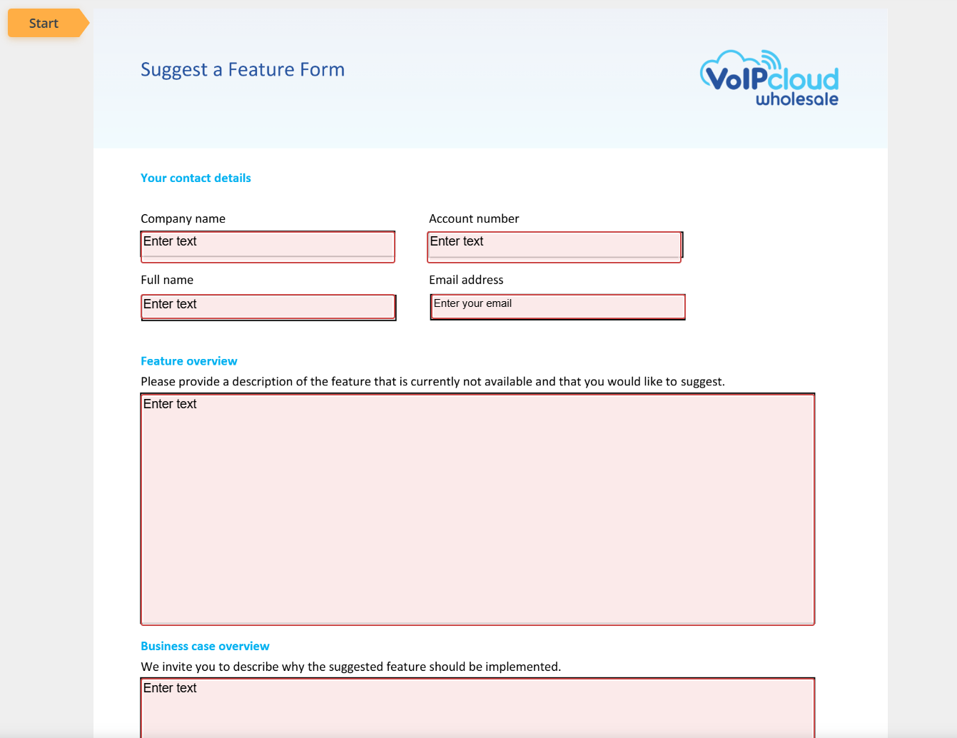 A new window will populate prompting you to enter your name and email address to be redirected to the feature request form. In this form, enter your business details, such as company name, account number and other relevant information.